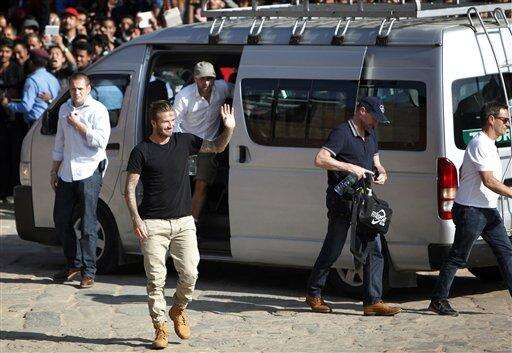 Former soccer player David Beckham waves at the fans as he arrives in Bhaktapur, Nepal, Friday, Nov. 6, 2015. Beckham is in Nepal filming a documentary for UNICEF. He played soccer with Nepalese children and visited a school in Bhaktapur that was damaged in April's devastating earthquake. (AP Photo/Niranjan Shrestha) The Associated Press