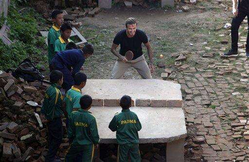 Former soccer player David Beckham plays pingpong with Nepalese students in Bhaktapur, Nepal, Friday, Nov. 6, 2015. Beckham is in Nepal filming a documentary for UNICEF. He played soccer with Nepalese children and visited a school in Bhaktapur that was damaged in April's devastating earthquake. (AP Photo/Niranjan Shrestha) The Associated Press