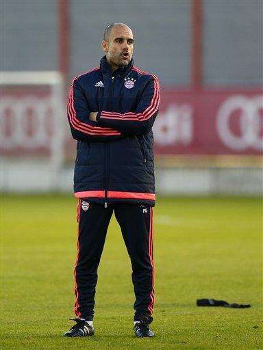 Bayern's head coach Pep Guardiola watches his team during a training session prior to the Champions League Group F soccer match against FC Arsenal in Munich, Germany, Tuesday Nov. 3, 2015. Bayern will face Arsenal Wednesday. (AP Photo/Matthias Schrader) The Associated Press
