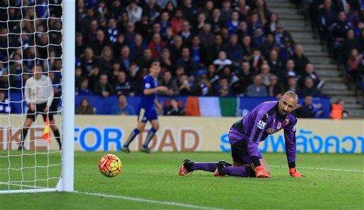 Watford goalkeeper Heurelho Gomes watches the ball from Leicester City's NâGolo Kante go into the net during the English Premier League soccer match at the King Power Stadium, Leicester, England, Saturday Nov. 7, 2015. (Nigel French/PA via AP) UNITED KINGDOM OUT