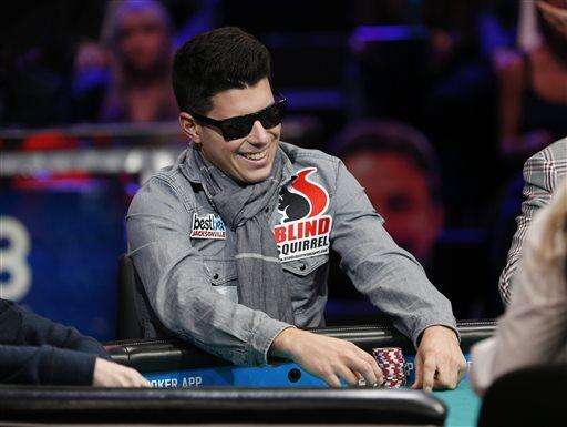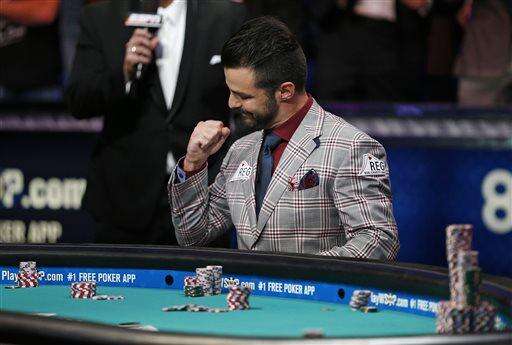 Max Steinberg reacts to his hand before knocking Tom Cannuli out of the World Series of Poker Monday, Nov. 9, 2015, in Las Vegas. Monday was the second of three days of marathon-length poker-playing before crowning a new champion and awarding more than $7 million to the winner. (AP Photo/John Locher) The Associated Press