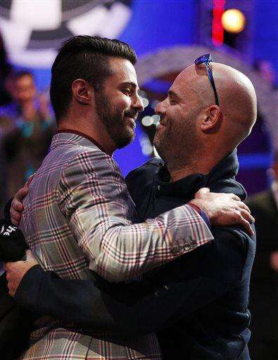 Max Steinberg, left, embraces Ofer Zvi Stern after Stern was knocked out of the World Series of Poker, Monday, Nov. 9, 2015, in Las Vegas. Monday was the second of three days of marathon-length poker-playing before crowning a new champion and awarding more than $7 million to the winner. (AP Photo/John Locher) The Associated Press