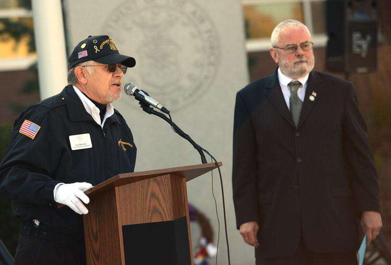 Les Montag, chairman of Hoffman Estates' Veterans Memorial Commission, speaks about the origins of Veterans Day, with Mayor William McLeod standing by, during the village's Veterans Day ceremony Wednesday.