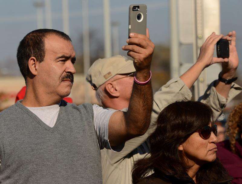Bartolo Galvez of Hoffman Estates records his daughter, Ainsley, in the Hoffman Estates High School Band, as it performed Wednesday at Hoffman Estates' Veterans Day ceremony.