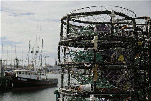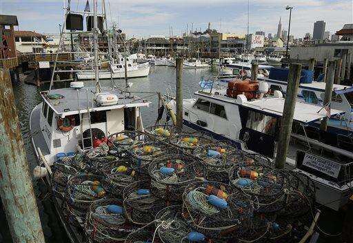 File - In this Nov. 5, 2015 file photo, a fishing boat sits loaded with crab pots waiting to go out at Fisherman's Wharf in San Francisco. The wharf typically bustles this time of year as dozens of crab fisherman prepare to haul millions of pounds of Dungeness crab that are a tradition at Thanksgiving and other holiday meals. But crab pots are sitting empty on docks, boats are idled and fishermen are anxiously waiting for authorities to open the lucrative Dungeness crab season. (AP Photo/Eric Risberg, File)