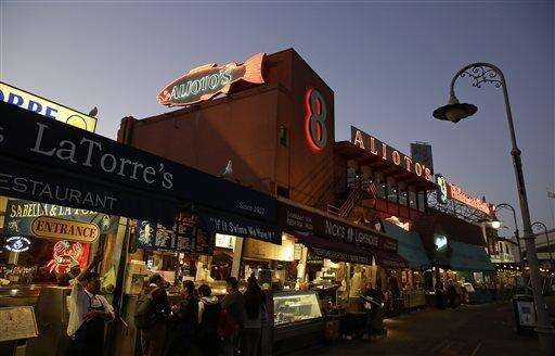 In this photo taken Tuesday, Nov. 10, 2015, are a number of crab and seafood stands at Fisherman's Wharf in San Francisco. The wharf typically bustles this time of year as dozens of crab fisherman prepare to haul millions of pounds of Dungeness crab that are a tradition at Thanksgiving and other holiday meals. But crab pots are sitting empty on docks, boats are idled and fishermen are anxiously waiting for authorities to open the lucrative Dungeness crab season. (AP Photo/Eric Risberg)