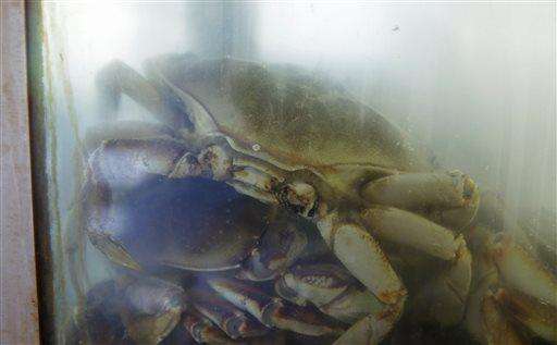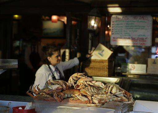 In this photo taken Tuesday, Nov. 10, 2015, imported Dungeness crabs from the Northwest are shown for sale outside a restaurant at Fisherman's Wharf in San Francisco. The wharf typically bustles this time of year as dozens of crab fisherman prepare to haul millions of pounds of Dungeness crab that are a tradition at Thanksgiving and other holiday meals. But crab pots are sitting empty on docks, boats are idled and fishermen are anxiously waiting for authorities to open the lucrative Dungeness crab season. Crab from the Northwest and Alaska can still be found in many restaurants and stores, including the wharf, and health officials say that crab is safe to eat. (AP Photo/Eric Risberg)