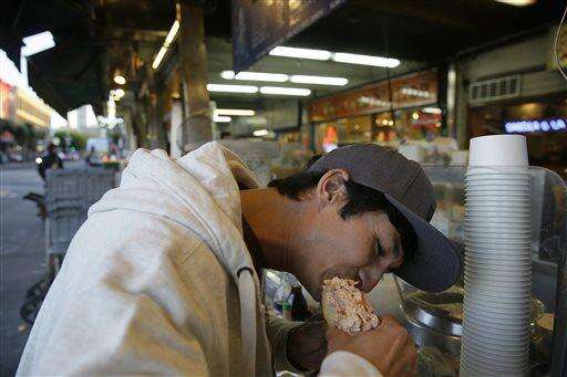 In this photo taken Tuesday, Nov. 10, 2015, Mark Covert, of Houston, eats a sandwich made with imported Dungeness crab from the Northwest at Fisherman's Wharf in San Francisco. The wharf typically bustles this time of year as dozens of crab fisherman prepare to haul millions of pounds of Dungeness crab that are a tradition at Thanksgiving and other holiday meals. But crab pots are sitting empty on docks, boats are idled and fishermen are anxiously waiting for authorities to open the lucrative Dungeness crab season. Crab from the Northwest and Alaska can still be found in many restaurants and stores, including the wharf, and health officials say that crab is safe to eat. (AP Photo/Eric Risberg)