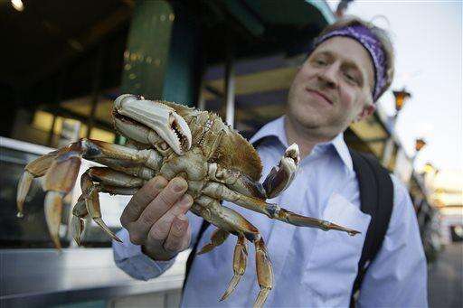 In this photo taken Tuesday, Nov. 10, 2015, Michael Bair, of Lexington, Ky., holds an imported Dungeness crab from the Northwest at Fisherman's Wharf in San Francisco. The wharf typically bustles this time of year as dozens of crab fisherman prepare to haul millions of pounds of Dungeness crab that are a tradition at Thanksgiving and other holiday meals. But crab pots are sitting empty on docks, boats are idled and fishermen are anxiously waiting for authorities to open the lucrative Dungeness crab season. Crab from the Northwest and Alaska can still be found in many restaurants and stores, including the wharf, and health officials say that crab is safe to eat. (AP Photo/Eric Risberg)