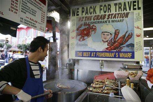 In this photo taken Tuesday, Nov. 10, 2015, Jinsen Zhao pulls an imported Dungeness crab from the Northwest out of a cooker at Fisherman's Wharf in San Francisco. The wharf typically bustles this time of year as dozens of crab fisherman prepare to haul millions of pounds of Dungeness crab that are a tradition at Thanksgiving and other holiday meals. But crab pots are sitting empty on docks, boats are idled and fishermen are anxiously waiting for authorities to open the lucrative Dungeness crab season. Crab from the Northwest and Alaska can still be found in many restaurants and stores, including the wharf, and health officials say that crab is safe to eat. (AP Photo/Eric Risberg)