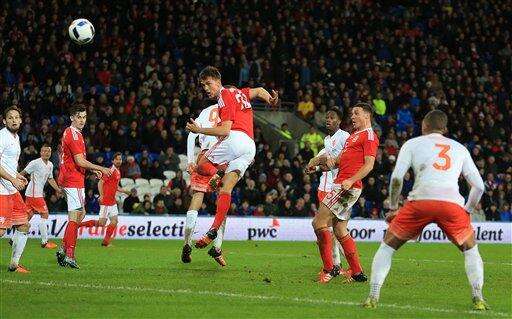 Wales' Emyr Huws, centre left, scores his side's second goal of the game during an international friendly soccer match against the Netherlands at the Cardiff City Stadium, Cardiff, Wales, Friday Nov. 13, 2015. (Nigel French/PA via AP) UNITED KINGDOM OUT The Associated Press