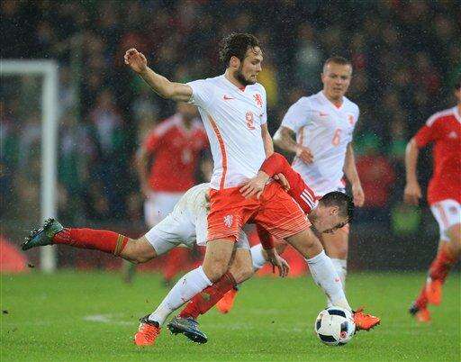 Wales' Tom Lawrence, rear, and Netherlands' Daley Blind battle for the ball during an international friendly soccer match at the Cardiff City Stadium, Cardiff, Wales, Friday Nov. 13, 2015. (Nigel French/PA via AP) UNITED KINGDOM OUT The Associated Press