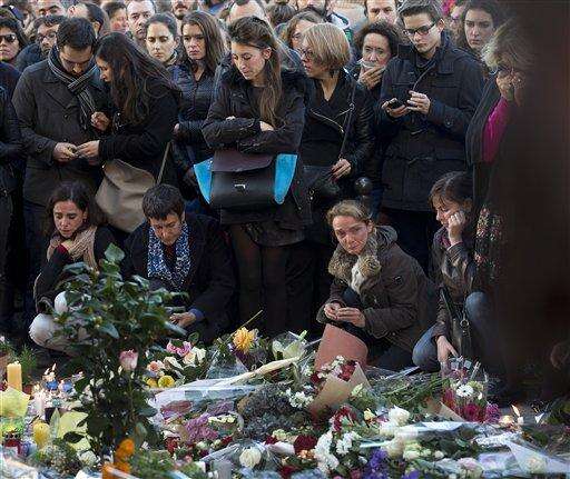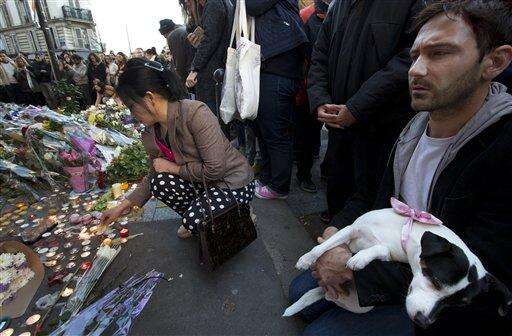 People pay their respect to the victims at the site of the attacks on restaurant Le Petit Cambodge (Little Cambodia) and the Carillon Hotel on the first of three days of national mourning in Paris, Sunday, Nov. 15, 2015. Thousands of French troops deployed around Paris on Sunday and tourist sites stood shuttered in one of the most visited cities on Earth while investigators questioned the relatives of a suspected suicide bomber involved in the country's deadliest violence since World War II. (AP Photo/Peter Dejong) The Associated Press