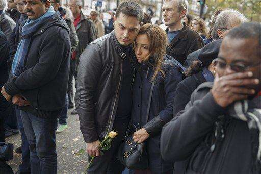 Crowds gathered at a makeshift monument at Republique Plaza in a neighborhood targeted by the attacks, where a banner reads "Can't Scare Us."