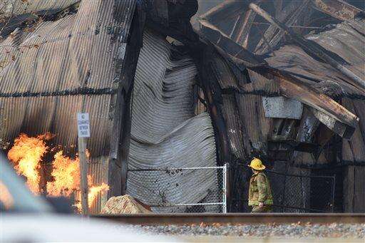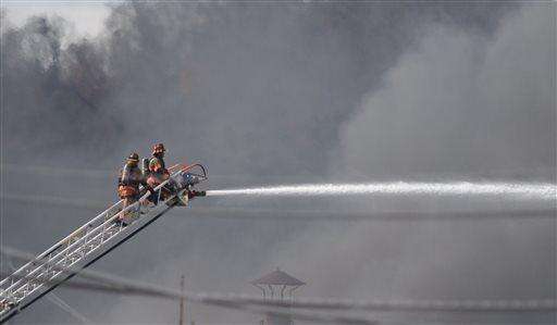 Firefighters battle a chemical warehouse fire in Leetsdale, Pa., Tuesday, Nov. 17, 2015. The large, smoky chemical warehouse fire near Pittsburgh has forced residents from about 70 nearby homes to be evacuated and injured several people. (Bob Donaldson/Pittsburgh Post-Gazette via AP) MAGS OUT; NO SALES; MONESSEN OUT; KITTANNING OUT; CONNELLSVILLE OUT; GREENSBURG OUT; TARENTUM OUT; NORTH HILLS NEWS RECORD OUT; BUTLER OUT; MANDATORY CREDIT The Associated Press