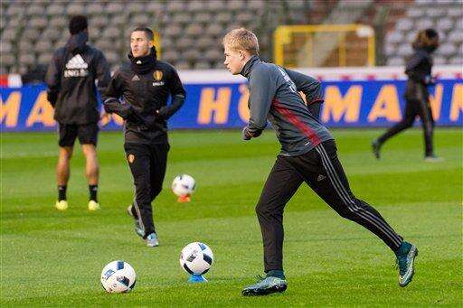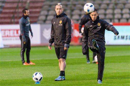Belgium's national soccer team players Radja Nainggolan, center, looks at Eden Hazard as he kicks the ball during a training session at the King Baudouin stadium in Brussels on Monday, Nov. 16, 2015. On Tuesday, Belgium and Spain play a friendly match in Brussels. (AP Photo/Geert Vanden Wijngaert)