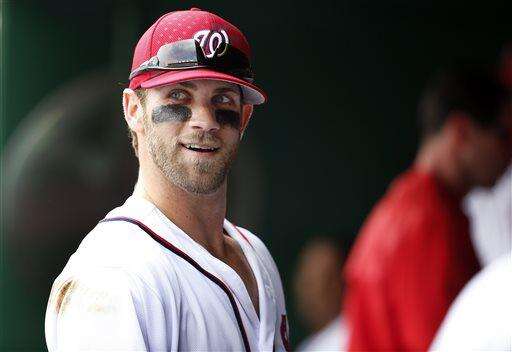 FILE - In this Saturday, July 4, 2015 file photo, Washington Nationals right fielder Bryce Harper (34) pauses in the dugout before a baseball game against the San Francisco Giants at Nationals Park in Washington. Bryce Harper has become the youngest unanimous MVP winner in baseball history, capturing the NL award during a season in which his Washington Nationals missed the playoffs. Harper got all 30 first-place votes from members of the Baseball Writers' Association of America in results announced Thursday, Nov. 19, 2015. (AP Photo/Alex Brandon, File) The Associated Press
