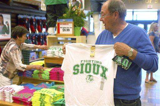 FILE - In this, Tuesday, June 12, 2012, file photo, Buck Striebel holds up a University of North Dakota Fighting Sioux T-shirt while his wife, GaeLynn, sorts through other shirts on sale at a sporting goods store in Bismarck, N.D. The school adopted the nickname the Fighting Hawks on Wednesday, Nov. 18, 2015, to replace the Fighting Sioux. Students across the United States are pressuring their colleges to update mascots, mottos and building names that they say are insensitive. (AP Photo/James MacPherson, File) The Associated Press