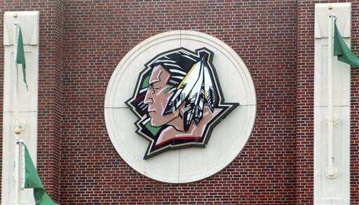 FILE - In this Nov. 9, 2010, file photo, the University of North Dakota's Fighting Sioux logo hangs on Ralph Engelstad Arena in Grand Forks, N.D. The school adopted the nickname the Fighting Hawks on Wednesday, Nov. 18, 2015, to replace the Fighting Sioux. Students across the United States are pressuring their colleges to update mascots, mottos and building names that they say are insensitive. (AP Photo/Dave Kolpack, File) The Associated Press