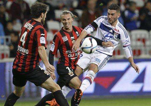Lyon's Jordan Ferri, right, challenges for the ball with Nice's Paul Baysse, left and Nice's Niklas Hult, during the French League One soccer match between Nice and Lyon, Friday, Nov. 20, 2015 in Nice stadium, southeastern France. (AP Photo/Lionel Cironneau) The Associated Press