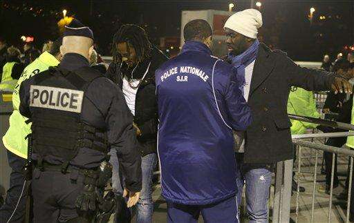 Supporters are checked by policemen at the entrance of the Nice stadium before the French League One soccer match between Nice and Lyon, Friday, Nov. 20, 2015, in Nice, southeastern France. Security at the stadium is enhanced after last Paris Friday's attacks that killed 129 people and wounded hundreds of others. (AP Photo/Lionel Cironneau) The Associated Press