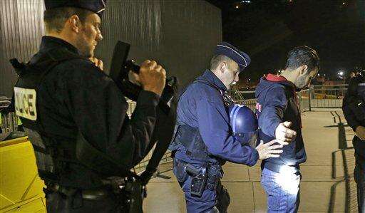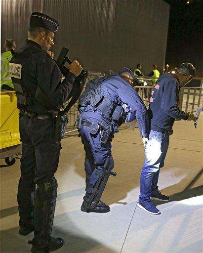 A supporter is checked by French policemen at the entrance of the Nice stadium before the French League One soccer match between Nice and Lyon, Friday, Nov. 20, 2015, in Nice, southeastern France. Security at the stadium is enhanced after last Paris Friday's attacks, that killed 129 people and wounded hundreds of others. (AP Photo/Lionel Cironneau) The Associated Press
