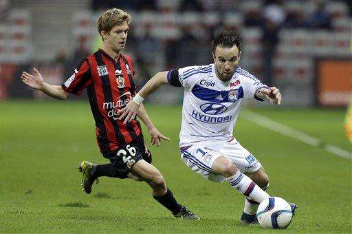 Lyon's Mathieu Valbuena, right, challenges for the ball with Nice's Vincent Koziello during the French League One soccer match between Nice and Lyon, Friday, Nov. 20, 2015 in Nice stadium, southeastern France. (AP Photo/Lionel Cironneau) The Associated Press