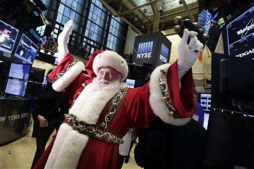 Santa Claus, from the Macy's Thanksgiving Day Parade, visits the trading floor of the New York Stock Exchange before the opening bell, Wednesday, Nov. 25, 2015. (AP Photo/Richard Drew) The Associated Press