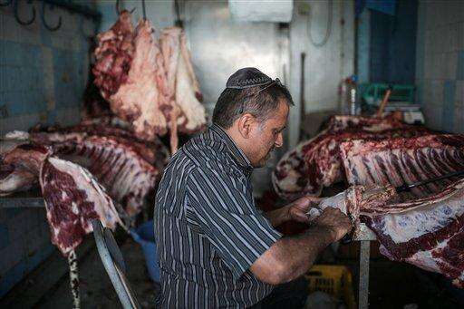 In this Wednesday, Oct. 28, 2015 photo, Char Haddad, 45, prepares meat in his kosher slaughterhouse at Hara Kbira, the main Jewish neighborhood on the Island of Djerba, southern Tunisia. The surrounding streets include a kosher butcher, a bakery that sells a traditional tuna-filled pastry known as “brik” and schools that teach lessons in Hebrew, French and Arabic. (AP Photo/Mosa'ab Elshamy) The Associated Press
