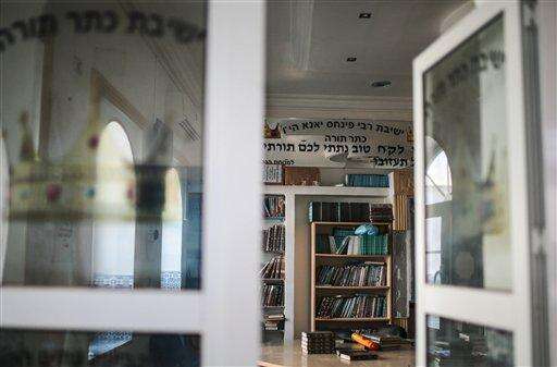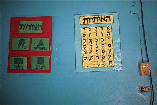 In this Friday, Oct. 30, 2015 photo, Hebrew educational material is viewed inside a class at a Talmudic school at Hara Kbira, the main Jewish neighborhood on the Island of Djerba, southern Tunisia. When school lets out, the streets around the ancient synagogue on this Tunisian island fill with rambunctious boys wearing Jewish kippahs and girls in long skirts, shouting to each other in Hebrew, Arabic and French.(AP Photo/Mosa'ab Elshamy) The Associated Press