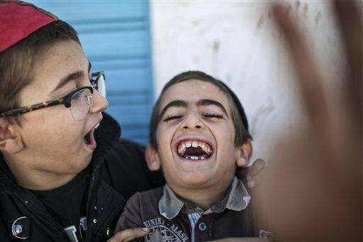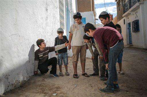 In this Friday, Oct. 30, 2015 photo, boys play with marbles outside their school at Hara Kbira, the main Jewish neighborhood in the Island of Djerba, southern Tunisia. The Jewish community on the resort island of Djerba traces its roots all the way back to Babylonian exile of 586 B.C., and is one of the few communities of its kind to have survived the turmoil around the creation of Israel, when more than 800,000 Jews across the Arab world either emigrated or were driven from their homes. (AP Photo/Mosa'ab Elshamy) The Associated Press