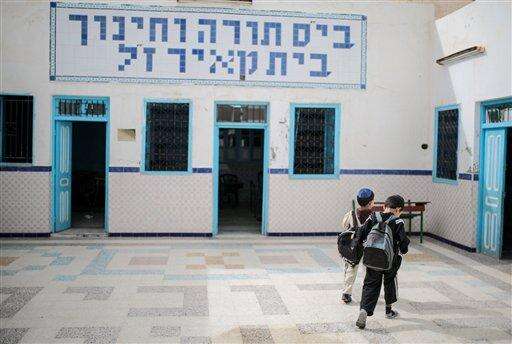 In this Friday, Oct. 30, 2015 photo, boys walk inside a Talmudic school at Hara Kbira, the main Jewish neighborhood on the Island of Djerba, southern Tunisia. When school lets out, the streets around the ancient synagogue on this Tunisian island fill with rambunctious boys wearing Jewish kippahs and girls in long skirts, shouting to each other in Hebrew, Arabic and French. (AP Photo/Mosa'ab Elshamy) The Associated Press
