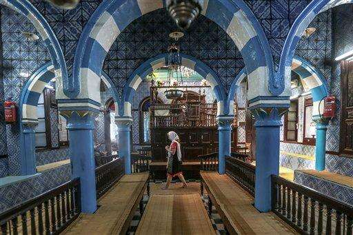 In this Wednesday, Oct. 28, 2015 photo, a tourist visits La Ghriba, the oldest synagogue in Africa, on the Island of Djerba, southern Tunisia. Beneath intricate tile walls bearing blue and yellow geometric shapes that would not seem out of place at a mosque. The synagogue’s name can be translated as “strange” or “miraculous.” (AP Photo/Mosa'ab Elshamy) The Associated Press