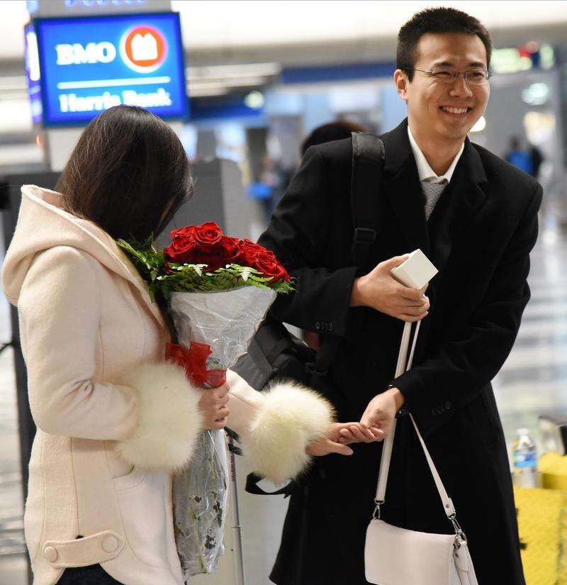 Yanjing Wang, left, a student at Washington University in St. Louis, and Teng Chi, a student at Purdue University, rendezvous Wednesday at O'Hare International Airport, where Chi successfully proposed marriage. Bob Chwedyk/bchwedyk@dailyherald.com