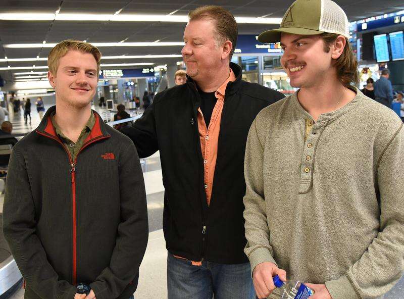 Proud father Dan Hanebrink of St. Charles picks up sons Kurt, left, and Brett on Wednesday at O'Hare. Kurt goes to school at Skidmore College in upstate New York, and Brett attends Ohio University. Bob Chwedyk/bchwedyk@dailyherald.com