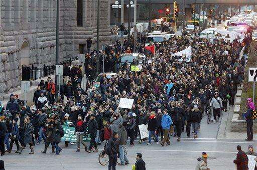 Black Lives Matter demonstrators and supporters march through downtown Minneapolis, Tuesday, Nov. 24, 2015, to the Federal Building. The fatal shooting of Jamar Clark, an unarmed black man by a Minneapolis police officer, has pushed racial tensions in the city's small but concentrated minority community to the fore, with the police precinct besieged by the makeshift encampment and many protesters. (AP Photo/Jim Mone)