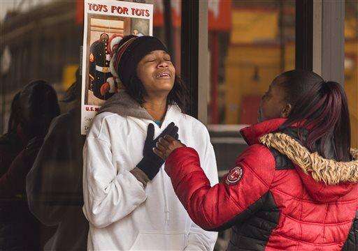 Friends grieve outside the church where Jamar Clark's funeral was held, at Shiloh Temple International Ministries, in Minneapolis, Wednesday, Nov. 25, 2015. A steady stream of mourners entered the north Minneapolis church on Wednesday to pay their respects to Clark whose death in a confrontation with police sparked more than a week of protests. (Richard Tsong-Taatarii /Star Tribune via AP) MANDATORY CREDIT; ST. PAUL PIONEER PRESS OUT; MAGS OUT; TWIN CITIES LOCAL TELEVISION OUT