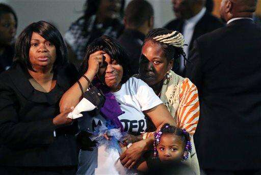 Family members of Jamar Clark are overcome with emotion as they said their goodbyes during his funeral services at Shiloh Temple International Ministries Wednesday, Nov. 25, 2015 in Minneapolis. A steady stream of mourners entered the north Minneapolis church on Wednesday to pay their respects to Clark, whose death in a confrontation with police sparked more than a week of protests. (Jerry Holt/Star Tribune via AP) MANDATORY CREDIT; ST. PAUL PIONEER PRESS OUT; MAGS OUT; TWIN CITIES LOCAL TELEVISION OUT