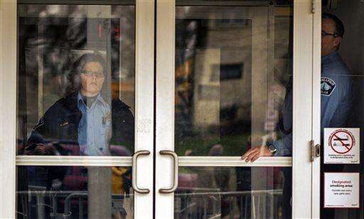 A couple police officers look out a door as the funeral procession for Jamar Clark passed by the Minneapolis Police Departmentâs 4th Precinct, Wednesday, Nov. 25, 2015, in Minneapolis. Clark, whose death in a confrontation with police, has sparked more than a week of protests. (Richard Tsong-Taatarii/Star Tribune via AP) MANDATORY CREDIT; ST. PAUL PIONEER PRESS OUT; MAGS OUT; TWIN CITIES LOCAL TELEVISION OUT