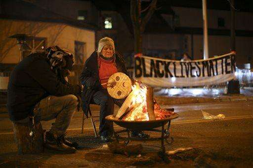 People warm themselves as they demonstrate since the Nov. 10 shooting of 24-year-old Jamar Clark, in front of the Minneapolis Police 4th Precinct on Tuesday, Nov. 24, 2015. Minneapolis police were searching Tuesday for three white males suspected of shooting at five Black Lives Matter demonstrators, while the family of a black man who was fatally shot by a city police officer called for the dayslong protests outside of the police precinct to end. (Jeff Wheeler/Star Tribune via AP)