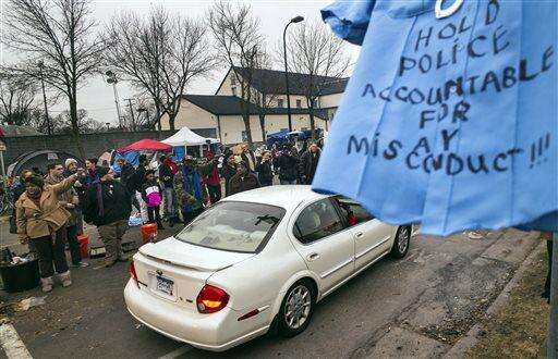 Demonstrators outside the Minneapolis Police Departmentâs 4th Precinct gesture as the the funeral procession for Jamar Clark passes by, Wednesday, Nov. 25, 2015, in Minneapolis. Clark, whose death in a confrontation with police, has sparked more than a week of protests. (Richard Tsong-Taatarii/Star Tribune via AP) MANDATORY CREDIT; ST. PAUL PIONEER PRESS OUT; MAGS OUT; TWIN CITIES LOCAL TELEVISION OUT