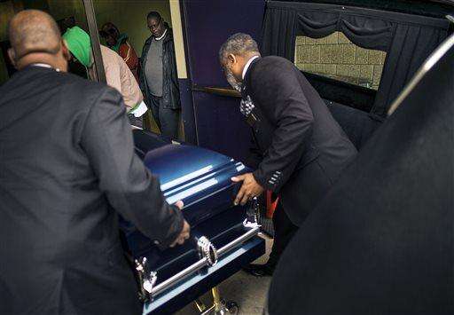 Irma Burns, center, mother of Jamar Clark, is escorted from her son's casket during funeral services at Shiloh Temple International Ministries Wednesday, Nov. 25, 2015 in Minneapolis. A steady stream of mourners entered the north Minneapolis church on Wednesday to pay their respects to Clark, whose death in a confrontation with police sparked more than a week of protests. (Jerry Holt/Star Tribune via AP) MANDATORY CREDIT; ST. PAUL PIONEER PRESS OUT; MAGS OUT; TWIN CITIES LOCAL TELEVISION OUT