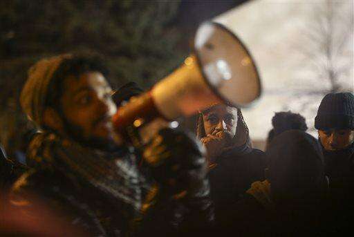 People gather around a demonstrator speaking about his encounter with attackers who were shooting at five protesters near the Minneapolis Police 4th Precinct earlier in the night, as protesters gather in front of the precinct in Minneapolis on Tuesday, Nov. 24, 2015. Minneapolis police were searching Tuesday for three white males suspected of shooting at five Black Lives Matter demonstrators, while the family of a black man who was fatally shot by a city police officer called for the dayslong protests outside of the police precinct to end. (Jeff Wheeler/Star Tribune via AP)