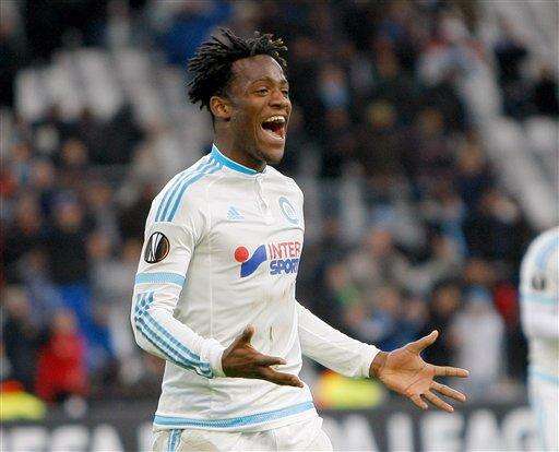 Marseille's Belgian forward Michy Batshuayi, reacts after scoring against Groningen, during a group F Europa League soccer match between Marseille and Groningen, at the Velodrome stadium, in Marseille, southern France, Thursday, Nov.26, 2015. (AP Photo/Claude Paris) The Associated Press
