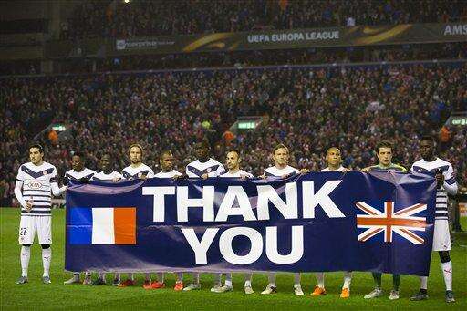 Bordeaux players hold up a banner in thanks for British support after the recent Paris attacks prior to the Europa League Group B soccer match between Liverpool and Bordeaux at Anfield Stadium, Liverpool, England, Thursday Nov. 26, 2015. (AP Photo/Jon Super) The Associated Press