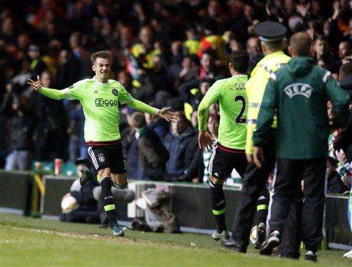 Ajax's Vaclav Cerny, left, celebrates scoring his sides second goal against Celtic, during the UEFA Europa League match at Celtic Park, Glasgow, Thursday Nov. 26, 2015. (Danny Lawson / PA via AP) UNITED KINGDOM OUT - NO SALES - NO ARCHIVES The Associated Press