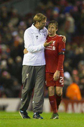 Liverpool's manager Juergen Klopp, left, walks from te pitch with Lucas Leiva after their team's 2-1 in the Europa League Group B soccer match between Liverpool and Bordeaux at Anfield Stadium, Liverpool, England, Thursday Nov. 26, 2015. (AP Photo/Jon Super) The Associated Press