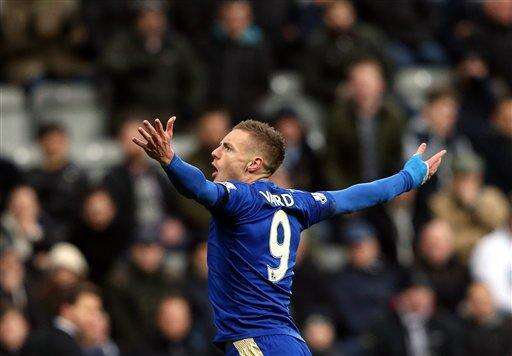 Leicester City's Jamie Vardy celebrates his goal during the English Premier League soccer match between Newcastle United and Leicester City at St James' Park, Newcastle, England, Saturday, Nov. 21, 2015. (AP Photo/Scott Heppell) The Associated Press