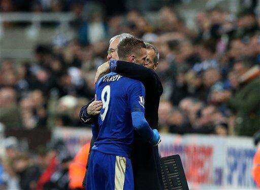 Leicester City's Jamie Vardy, right, recieves a hug from manager Claudio Ranieri, left, during the English Premier League soccer match between Newcastle United and Leicester City at St James' Park, Newcastle, England, Saturday, Nov. 21, 2015. (AP Photo/Scott Heppell) The Associated Press