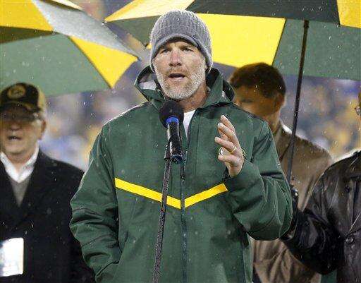 Brett Favre speaks during a ceremony at halftime of an NFL football game between the Green Bay Packers and Chicago Bears Thursday, Nov. 26, 2015, in Green Bay, Wis. Favre’s retired No. 4 and name were unveiled inside Lambeau Field during the ceremony. (AP Photo/Mike Roemer) The Associated Press